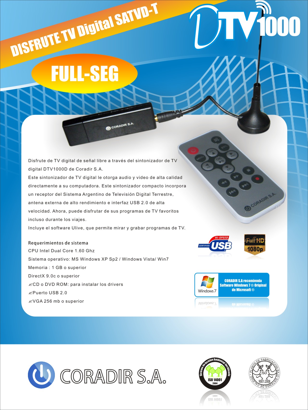 Con del sintonizador DTV1000, disfrute de TV digital de señal libre brindándole audio y video de alta calidad directamente a su computadora. Este sintonizador compacto incorpora un receptor del Sistema Argentino de Televisión Digital Terrestre, antena externa de alto rendimiento e interfaz USB 2.0 de alta velocidad. Ahora, puede disfrutar de sus programas de TV favoritos incluso durante los viajes. Incluye el software Ulive, que le permite mirar y grabar programas de TV.